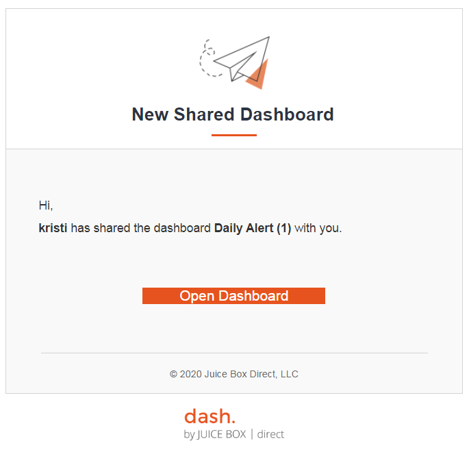 When a new dashboard has been shared with you, you will both 1) receive an email notification that the dashboard is now available in your dash homepage and 2) see the new dashboard on the homepage.