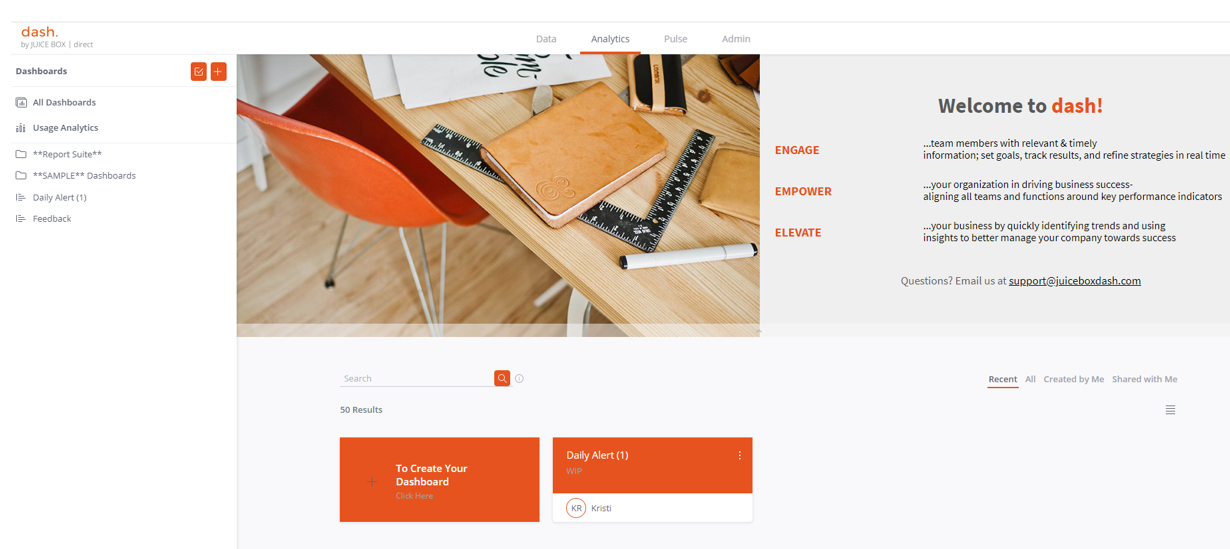 In the Analytics tab, you can see all dashboards that are shared with you on the left hand side of the screen. All recently viewed dashboards can also be quickly accessed in the main body of the page. Top open any dashboard, simply click on the title ...