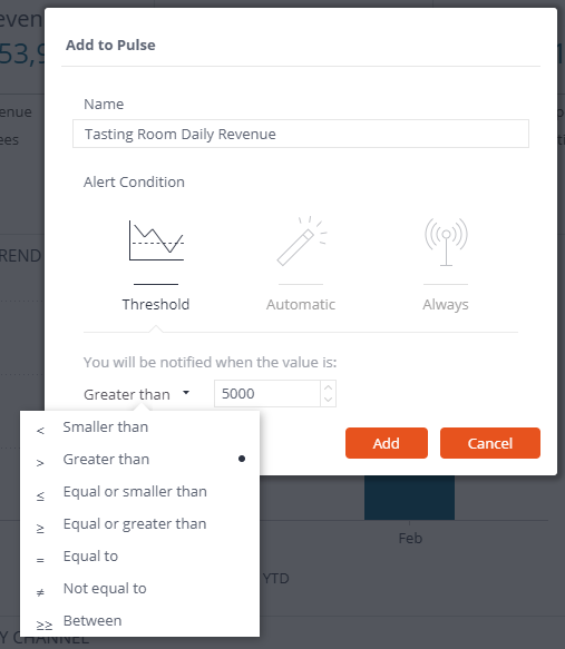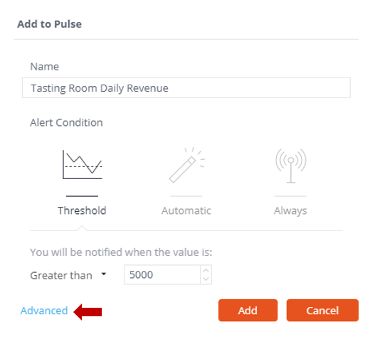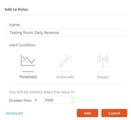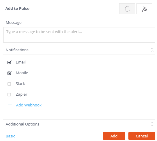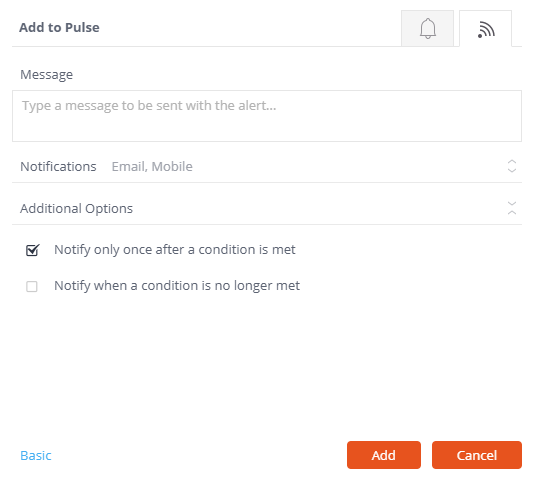 Click Add to create the desired Alert. After you create an Alert, the Alert is added to your Pulse page where you can manage the Alert and its notifications.