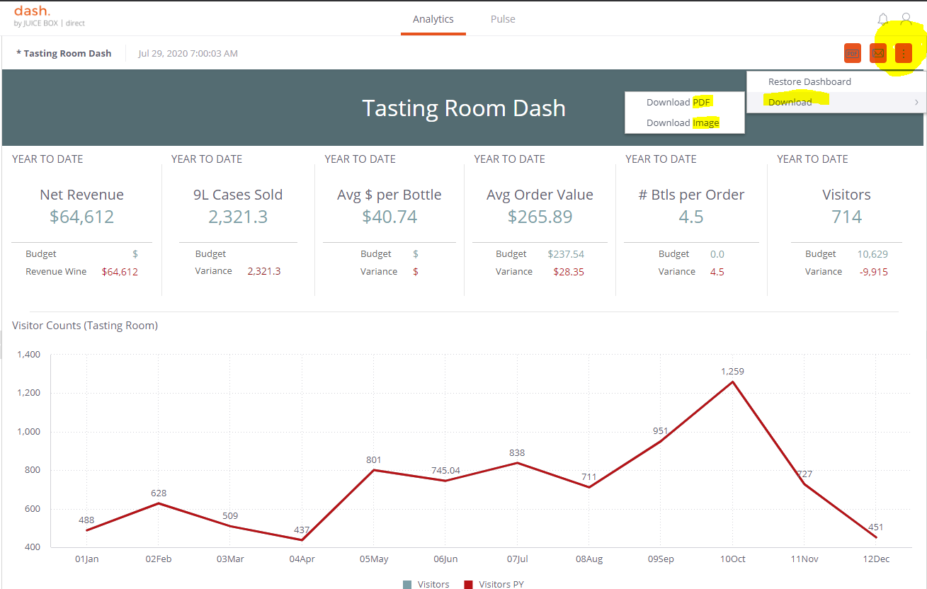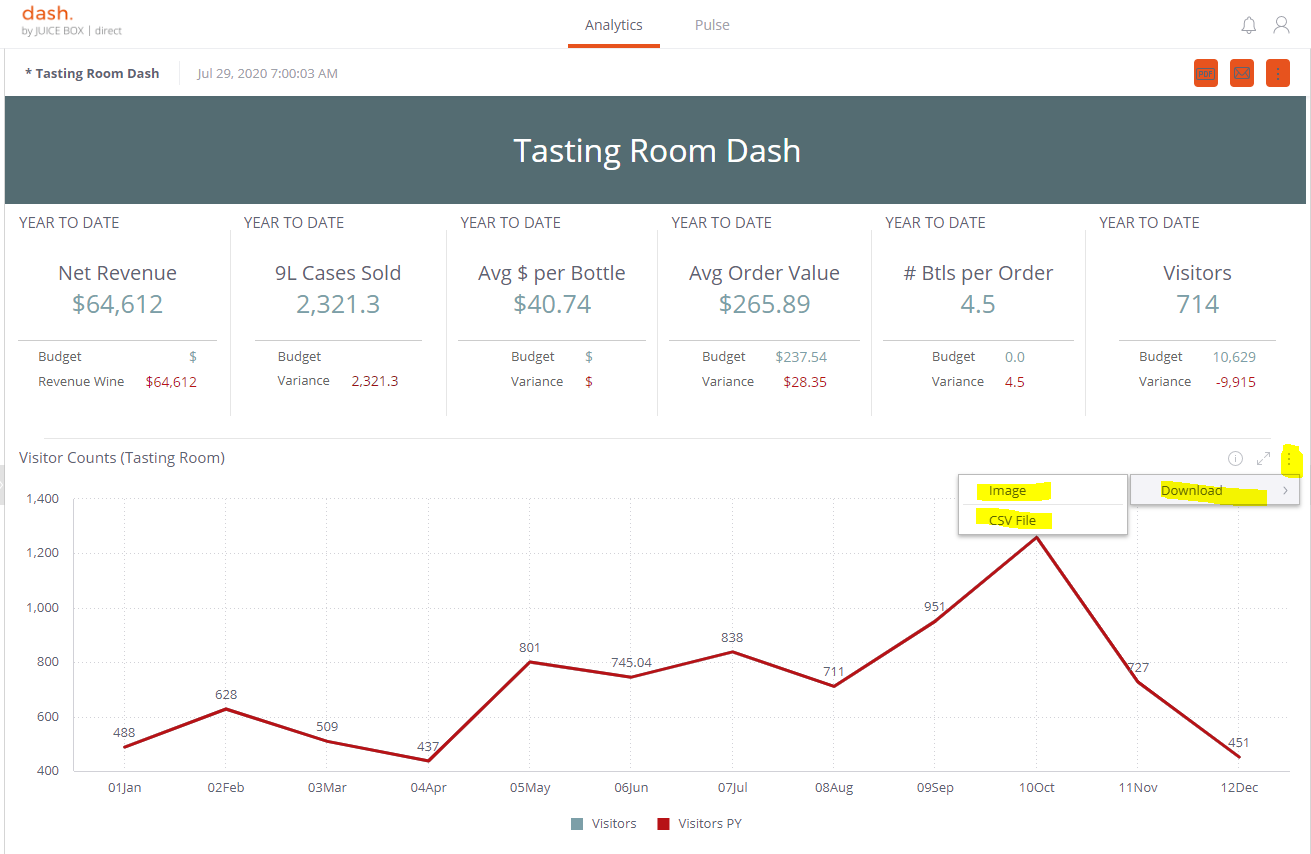 To export an entire dashboard, open the desired dashboard and select the icon in the upper right hand corner. Choose download and your desired download format: